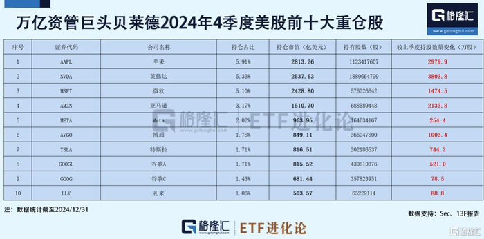 贝莱德的前十大重仓股分别是苹果、英伟达、微软、亚马逊、Meta、博通、特斯拉、谷歌A、谷歌C和礼来。
