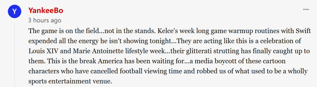 比赛是在球场上进行……而不是在看台上。特拉维斯整整一周都和霉霉一起进行赛前预热活动,耗尽了精力,以至于今晚在场上毫无状态……他们那些名人的招摇行径终于让他们尝到了苦头。这是美国一直在等待的转机……对这些 “卡通人物” 进行媒体抵制,他们挤占了橄榄球比赛的观赛时间,抢走了我们曾经纯粹的体育娱乐空间。