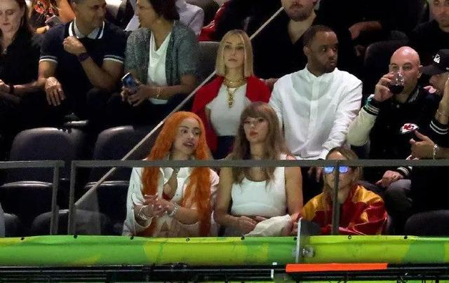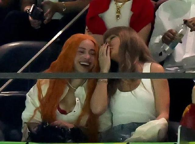 霉霉满脸困惑地瞥了一眼坐在身旁的好友、美国歌手埃丝·史佩斯(Ice Spice),然后淡定地笑了笑。