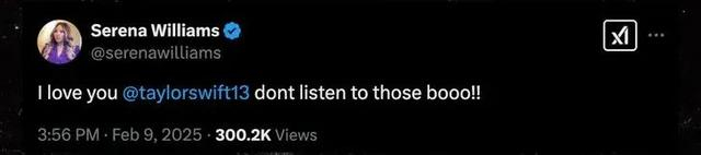 虽然霉霉很淡定,但她的好友塞雷娜·威廉姆斯(Serena Williams)坐不住了。