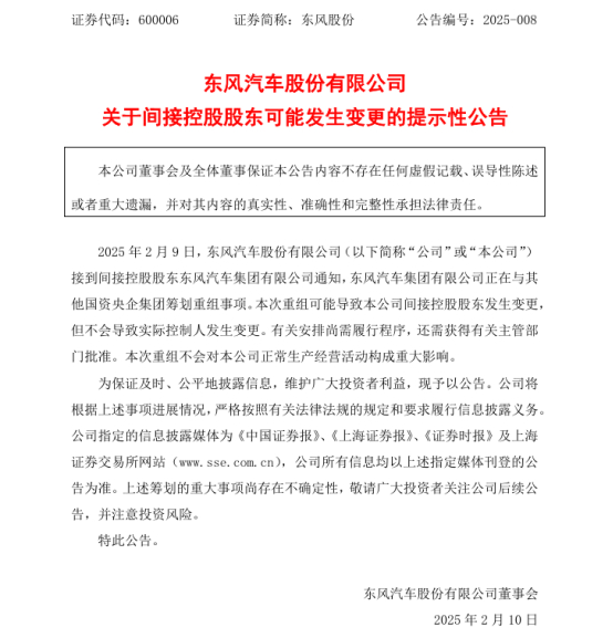 东风汽车股份有限公司发布公告称接到间接控股股东东风汽车集团有限公司通知,东风汽车集团有限公司正在与其他国资央企集团筹划重组事项。