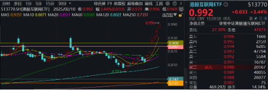 布局工具上,港股互联网ETF(513770)跟踪中证港股通互联网指数(931637),权重股汇聚腾讯控股、阿里巴巴、美团、小米集团、快手等互联网龙头公司,截至2024年末,前十大成份股权重超70%,龙头属性突出;2024全年日均成交额达2.65亿元,可日内T+0交易,不受QDII额度限制,流动性佳!一手不足100元,是低成本便捷投资港股互联网龙头的优质工具。