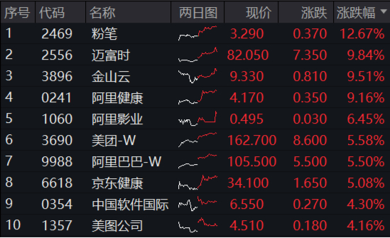 个股方面,科网板块30只成份股23股涨逾1%,13股涨超3%,DeepSeek概念股领涨居前,粉笔喜提两位数涨幅,迈富时、金山云、阿里健康均涨超9%,阿里影业涨超6%,美团、阿里巴巴均涨超5%,快手、腾讯控股涨超2%。