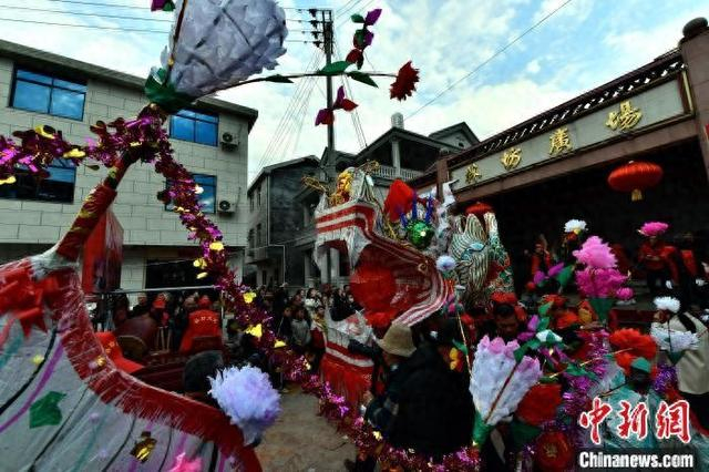 2月10日,村民抬着龙头准备接龙。中新社记者 张斌 摄