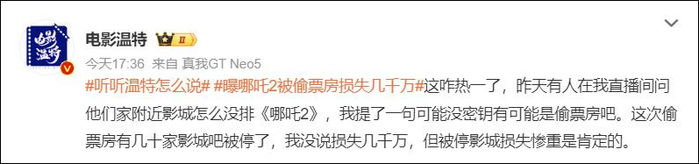 电影博主温特回应称“这次偷票房有几十家影城吧被停了,我没说损失几千万,但被停影城损失惨重是肯定的。”