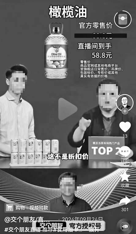 记者发现,这些切片账号发布视频很多在销售“橄榄油”。“这个我喜欢,(价格)非常香,这是一个补贴品,这个羊毛不薅白不薅,这个价格会让你看错了,是横扫各大网红直播间的大爆品。”一刷到这样的切片视频,就会出现罗永浩的声音。仔细查看视频,在画面上部的中间位置,往往有较大的字体标注“橄榄油”字样,但商品图片却是添加了橄榄油的“食用植物调和油”。在视频下方橱窗区域位置有与视频内容相关的商品链接,有的视频显示销售产品达到了几万单。记者点开其中一些商品链接发现,销售的是添加了少量橄榄油的“植物调和油”,并不是纯橄榄油。