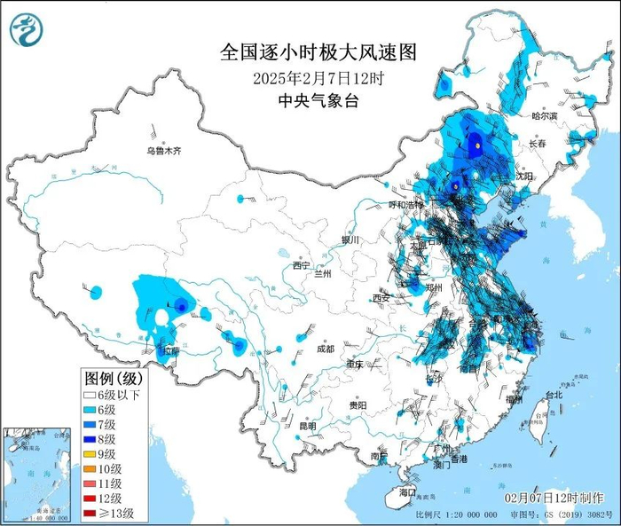 2025年2月7日12点我国极大风分布图 。(图/中央气象台)