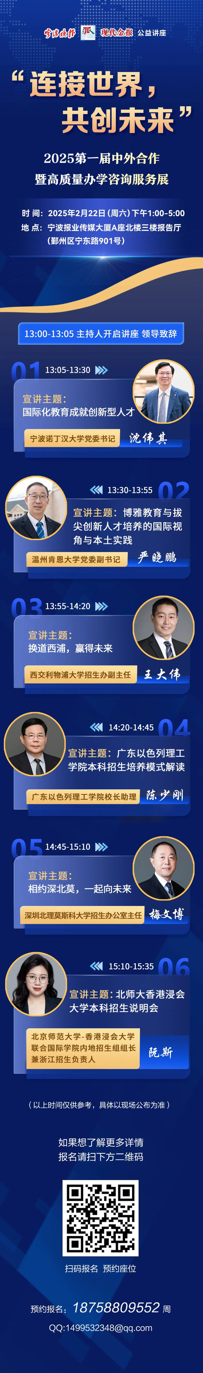 在这个全球化浪潮汹涌的时代,教育已成为连接世界、塑造未来的关键桥梁。为了搭建一个让广大考生和家长深入了解中外合作高校的优质平台,2025年2月22日(周六)下午1:00-5:00,宁波报业传媒大厦A座北楼三楼报告厅(鄞州区宁东路901号)将隆重举办“连接世界,共创未来”——2025第一届中外合作暨高质量办学咨询服务展。