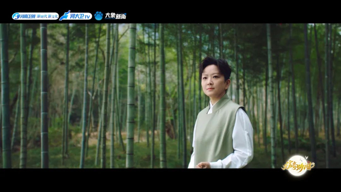 戏歌《竹韵》节目由王𤦍瑜演唱,以竹子护林员的视角切入竹林,将竹子不同的状态不同的品格通过歌曲与视觉画面,也选取了苏轼、郑板桥、岳飞出现在竹林之中,以这些人物咏竹的诗和自身的品格,呼应竹子的精神品格。王珮瑜在歌曲中回望自己从事戏曲的坚守,以《珠帘寨》一段“老只老孤的须发老”融于竹子的精神品格。最后以竹为引,引出孙家栋、黄旭华等一批时代楷模人物,以竹喻默默奉献着的每一位大国工匠,以竹致敬千万坚守在岗位的中国人。