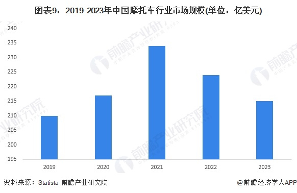 根据Statista披露的数据显示,中国摩托车行业市场规模在2021年达到近年来最高值,为234亿美元。之后,受消费者购买意愿下降以及供大于求导致的价格下降等因素影响,中国摩托车市场规模开始下滑,2023年为215亿美元,同比下降约4%。