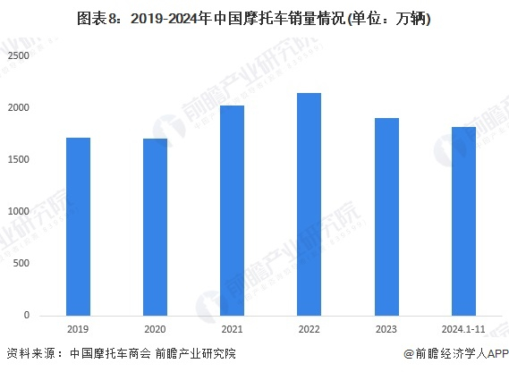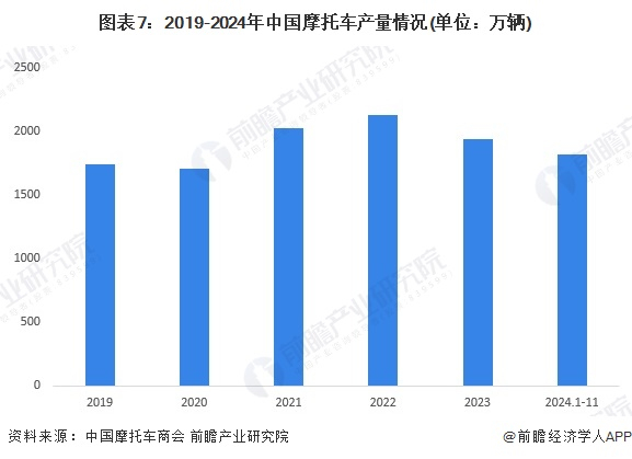 根据中国摩托车商会披露的数据显示,2019-2023年中国摩托车销量先增后降。2019-2022年,中国摩托车销量从1713.26万辆上涨至2142万辆,上涨幅度达到25%。2023年中国摩托车产量下降至1899.07万辆,主要由于消费者购买意愿下滑导致。2024年1-11月,中国摩托车销量为1816.45万辆。