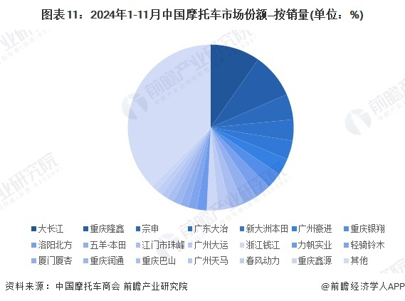 目前,中国摩托车行业竞争较为激烈,品牌数量较多。根据中国摩托车商会统计数据显示,2024年1-11月,全行业完成摩托车销量1816.45万辆,同比增长1.25%。市场份额占比较大的品牌有大长江、隆鑫、宗申、广东大冶、新大洲本田等。