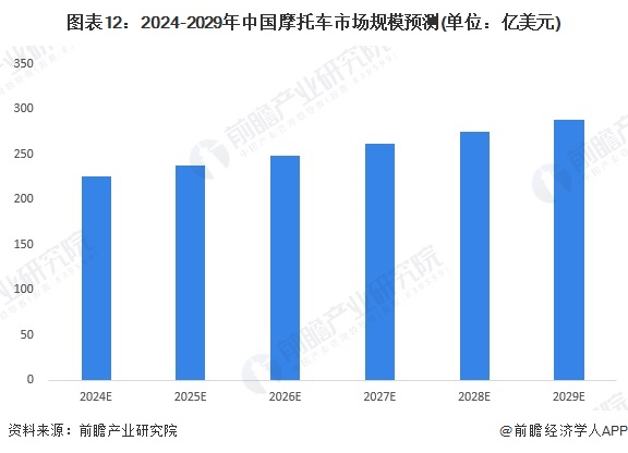 未来几年内,我国摩托车供需仍将受到国家环保政策的影响,行业发展转型进程将进一步加快,因此燃油摩托车产量增速将有所放缓,更多的则是行业内部的替代,电动摩托车产量占比将进一步提高,但行业整体规模回复上升态势。前瞻结合Statista预测,结合近年来中国摩托车市场发展情况,预计2024-2029年中国摩托车市场规模将按照CAGR为5%的速度增长,2029年市场规模达到288亿美元。