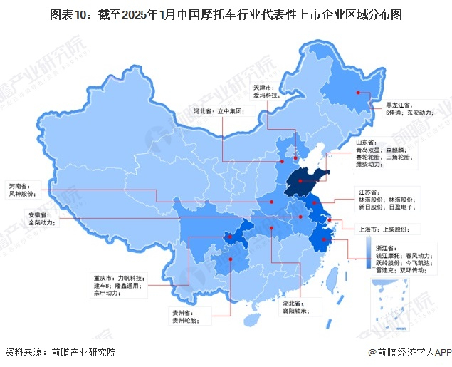 从我国上市摩托车企业区域分布来看,我国摩托车企业主要分布在东部沿海地区和中部川渝地区,其中山东、浙江企业数量最多。