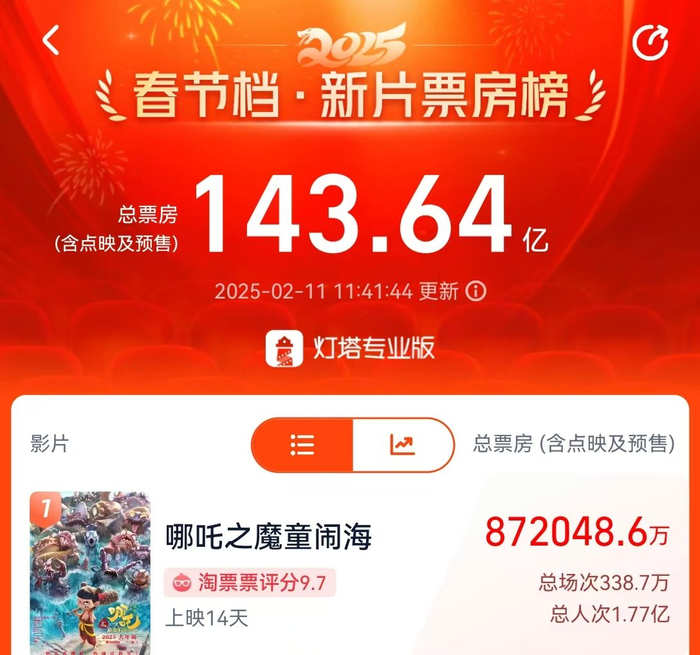 据灯塔专业版数据显示,截至2月11日11时41分,《哪吒2》票房超87亿元。灯塔专业版2月11日预测,《哪吒2》总票房将达到145.28亿元。