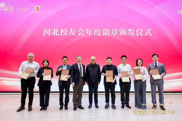 2024级新生依次上台自我介绍,展示自己的企业情况;河北校友会为6名新生颁发河北校友会年度徽章。