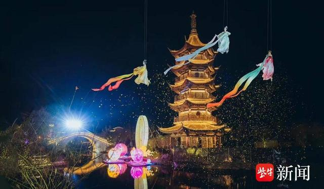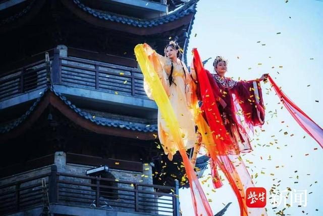 随着悠扬乐声响起,百花仙子身着华服,手持花篮从天而降。她们舞姿曼妙,沿途撒落花瓣,在半空中织就一幅流动的画卷......春节期间,珠溪古镇首次以大型威亚空中表演的形式,再现了小说《镜花缘》中《百花仙子下凡》的故事情节。