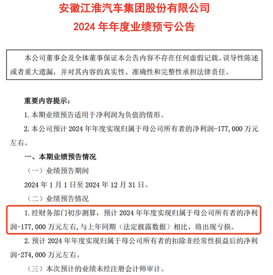 此前,江淮汽车披露了最新的业绩预告:预计2024年实现净利润约为-17.7亿元,扣非净利润约为-27.4亿元。