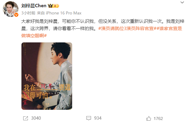 此外,初代网红刘梓晨也宣布参加《演员请就位3》,他表示:“大家好,我是刘梓晨,可能你不认识我,但没关系,这次重新认识我一次。我是刘梓晨,这次跨界,请你看看不一样的我。”
