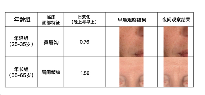 为了使研究结果兼具细节分析的专业性和整体感知的普遍性,10名经过多年培训的临床专家基于皮肤衰老图谱,对受试者额头皱纹、眉间皱纹、鱼尾纹等8种重点面部特征进行评分;并由60名非专业女性组成的小组通过盲测配对照片(早上与晚上组合)来评估其疲劳状态、年轻及暗沉程度[7]。
