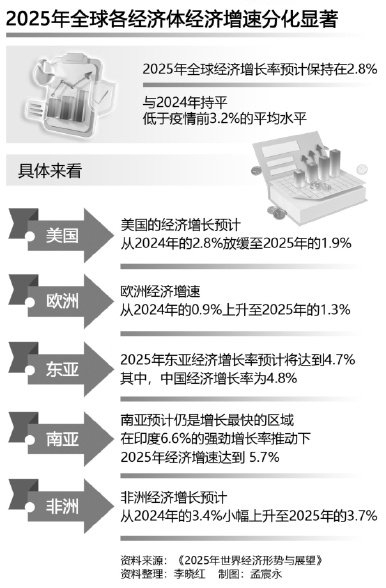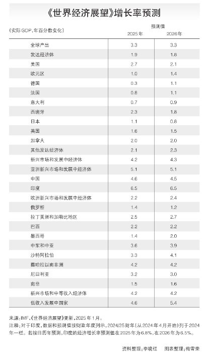 国际货币基金组织(IMF)近日发布的最新一期《世界经济展望报告》预计,2025年全球经济增速将达到3.3%,较2024年10月份的预测值高出0.1个百分点,但仍低于2000年至2019年3.7%的历史平均水平。同时,IMF预计,2026年全球经济增速也将保持在3.3%的水平。