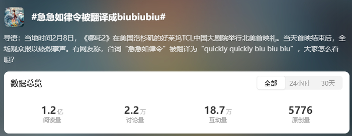 实际上,2019年,《哪吒之魔童降世》(《哪吒1》)出海时,微博就曾掀起哪吒台词梗翻译大赛。 针对“急急如律令”,有网友翻译为“fast fast biu biu”。 网友以“fast”对应“急急”,“biu”模拟法术特效声,兼顾趣味性与节奏感,成为当时网络热议的“神翻译”。