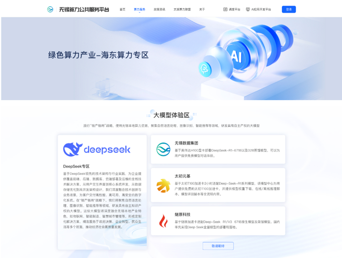 苏州市公共算力服务平台通过算力资源统一管理、运营、运维,连通东数西算节点城市算力基础设施,为客户提供低成本、高效率的算力资源和技术支持、平台支持等服务。相较于DeepSeek的APP端和网页端,公共算力服务平台提供的模型具有更强大的算力支持,能够对模型进行二次开发和微调,企业也可租用算力使用模型进行内部赋能。