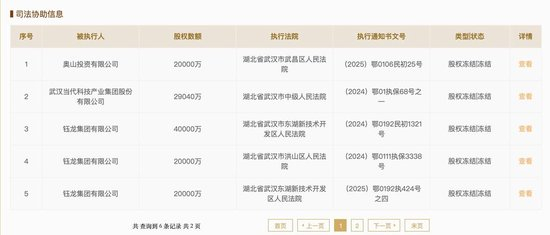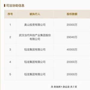 国家企业信用信息公示系统发布信息显示,奥山投资有限公司、钰龙集团有限公司分别被湖北省武汉市武昌区人民法院、湖北省武汉市东湖新技术开发区人民法院列入被执行人名单,被执行股权数额都是2000万。