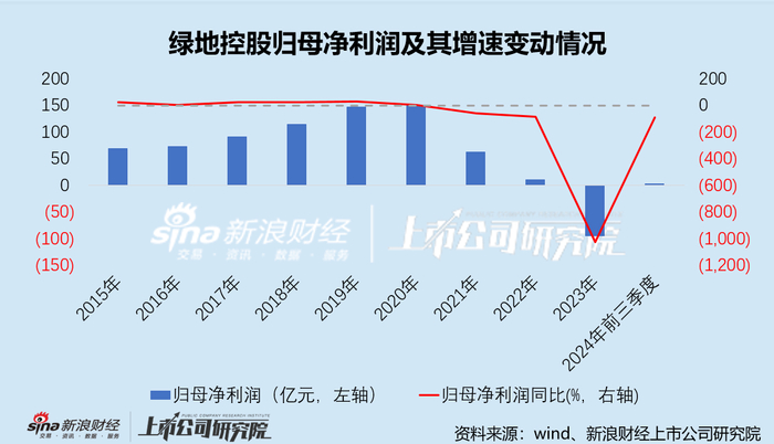 绿地真正陷入危机的标志性事件是2022年的债务违约。当年11月公司3.62亿美元的债券发生违约,此后公司多个项目被迫停工。当年业绩大跌,营业收入下跌近20%,归母净利润更是跌逾八成,形成“脚踝斩”。