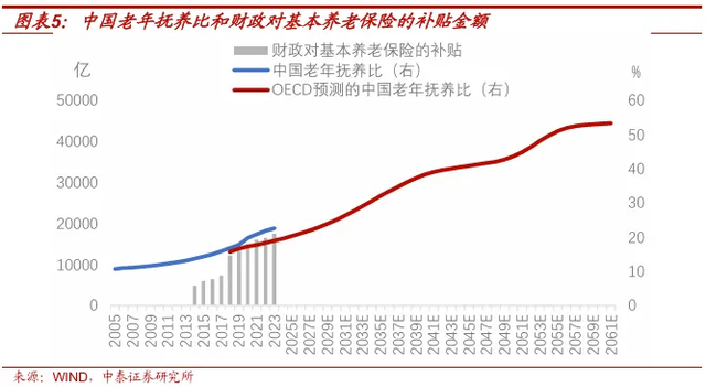 2014年到2023年,中国老年人口(65岁及以上)抚养比从13.7%提高到22.6%,同期财政对基本养老保险的补贴金额,从4798亿元提高到17511亿元。根据OECD偏保守的预测,2040年之前中国的老年人口抚养比将持续较快上升,2060年将达到53.1%,这意味着基本养老保险的缺口可能将长期且较快地扩大。