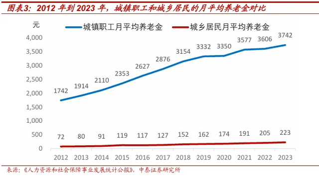 由此可见,目前对城镇居民社会保险相关的财政补贴集中在养老,而对农村居民社会保险相关的财政补贴则以医疗为主。2023年城乡居民月平均养老金为223元,同期城镇职工月平均养老金为3742元。这种差距一方面使得目前财政资金对农村养老的补贴相对较少,更多投向医疗,另一方面则意味着未来对农村养老的补贴大概率将保持高增长。