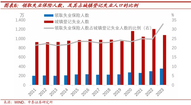 支出方面,以失业保险领取为例。2011年中国领取失业保险的人数为197万,占当年城镇登记失业人口的21.4%。2012年到2022年,这一比例在21%-25%之间小幅波动。2023年领取失业保险的人数提高至352万,占当年城镇登记失业人口的比例跳升到32.8%。考虑到失业保险等制度的日渐完善,失业后领取失业保险的比例未来可能会进一步提高。