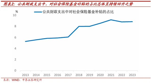 但对社会保险基金的财政补贴,占公共财政支出的比例逐年上升。2013年公共财政支出中,对社会保险基金的补贴占比为5.3%,2023年上升到了8.8%,剔除2021年的异常扰动外,最近十余年该比例呈持续回升之势。