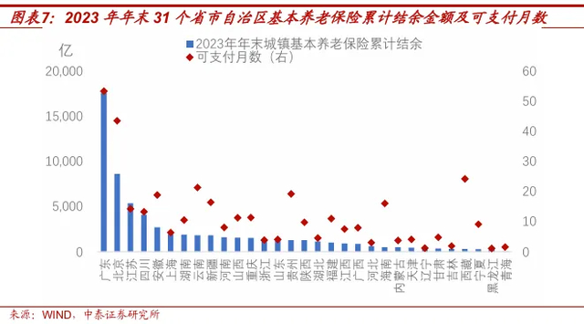 地区分化方面,以2023年31个省市自治区年末的基本养老保险累计结余为例。31个省市自治区中,广东省的累计结余最高,达到了1.75万亿元,北京和江苏的分别位列二、三,累计结余规模分别为8614亿元、5341亿元。广东、北京和江苏的累计结余总和,占全国31个省市自治区总和的49.5%,接近一半。江西、广西、河北等13个省市自治区2023年年末的基本养老保险累计结余都少于1000亿元,其中青海只有43.8亿元。
