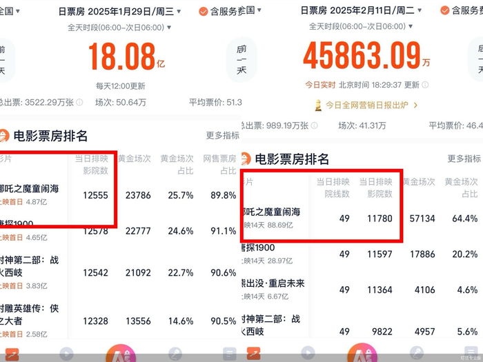 据灯塔专业版,1月29日上映首日,《哪吒2》全国排映的影院共计12555家,而截至2月11日17时只剩下11780家,减少了775家。