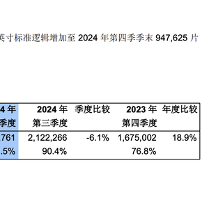 公告显示,其月产能从2024年第三季季末88.42万片折合8英寸标准逻辑,进一步增加至2024年第四季季末的94.76万片。