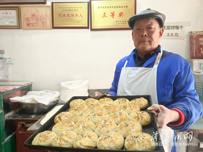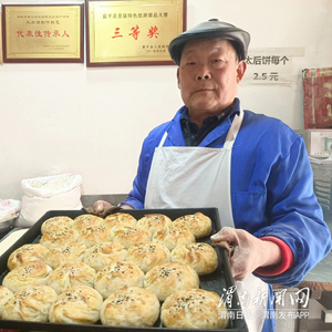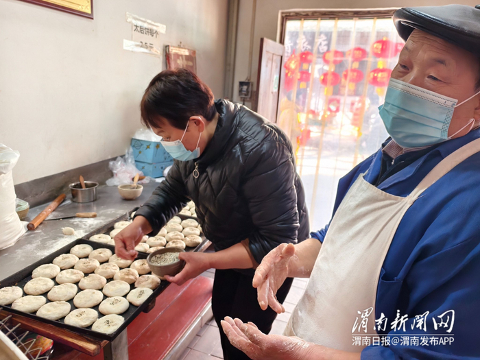 顾客口中的段师傅名叫段掌娃,今年70岁,是省级非物质文化遗产项目富平太后饼制作技艺的代表性传承人。富平太后饼历史源远流长,距今已有2000多年。据段掌娃介绍,20世纪30年代,富平唯一会做太后饼的王荆州(人称“荆州王”,家住富平金城堡)在南关十字北巷道孟振汉父亲的杂货铺门前摆摊售卖太后饼,并在此期间将制作技艺传授给孟振汉,如今市面上的太后饼便出自这一传承谱系。