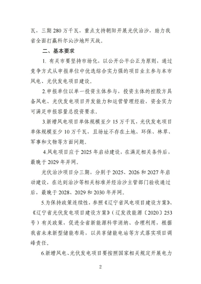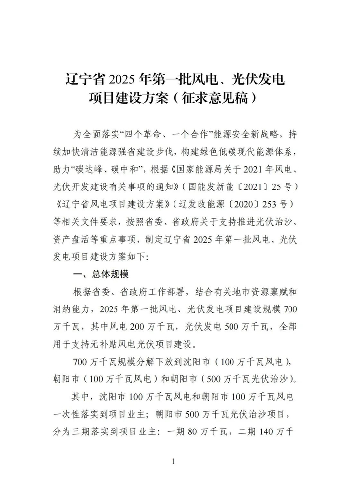 光伏5GW+风电2GW!辽宁2025年第一批风、光项目建设方案征求意见!全部无补贴、三年内全部建完!