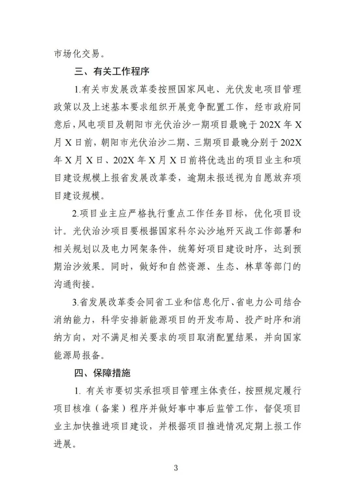 700万千瓦规模分解下放到沈阳市(100万千瓦风电),朝阳市(100万千瓦风电)和朝阳市(500万千瓦光伏治沙)。其中,沈阳市100万千瓦风电和朝阳市100万千瓦风电一次性落实到项目业主;朝阳市500万千瓦光伏治沙项目,分为三期落实到项目业主:一期80万千瓦,二期140万千瓦,三期280万千瓦,重点支持朝阳开展光伏治沙,助力辽宁省全面打赢科尔沁沙地歼灭战。