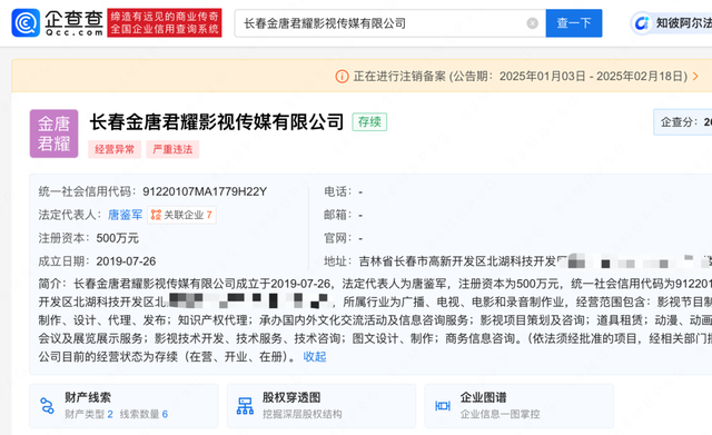 值得一提的是,唐鉴军持股51%的长春金唐君耀影视传媒有限公司因“异常名录满三年,仍未履行”于2023年7月被列入严重违法失信企业名单,该公司成立于2019年7月,注册资本500万元,唐鉴军担任法定代表人,该公司当前已发布注销备案公告,公告期自2025年1月3日至2025年2月18日。