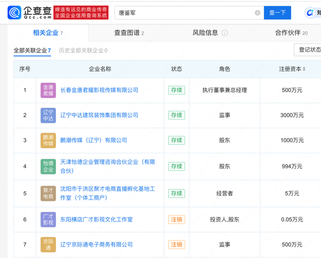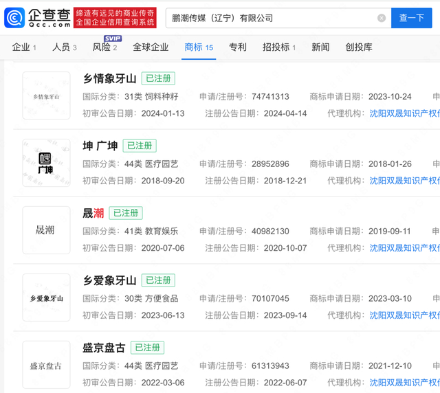 据企查查APP显示,因在《乡村爱情》饰演“谢广坤”一角被观众熟知的唐鉴军名下关联7家公司,5家为存续状态,其关联的鹏潮传媒(辽宁)有限公司已注册多枚“乡爱象牙山”“乡村爱情象牙山”等商标。