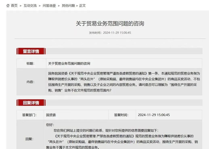 2022年2月9日、2023年1月4日、2023年12月18日、2024年3月22日、2024年8月16日、2024年11月29日、2024年12月25日,国务院国资委多次就贸易中“空转”“走单”行为,以及“融资性贸易”“两头在外”定义等网友关注的问题进行回复。让我们来看一看吧。