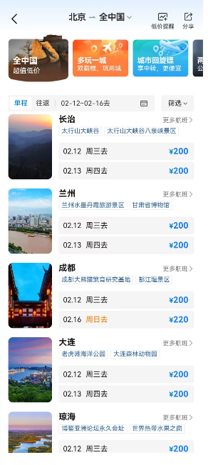 记者在携程旅行上搜索特价机票,临近出发时间,2月12日北京至成都、兰州、大连等地的机票价格下限均为200元。