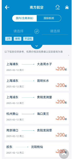 南方航空App上显示,2月12日从上海浦东前往昆明、贵阳,从杭州飞往海口,票价都是200元起步。