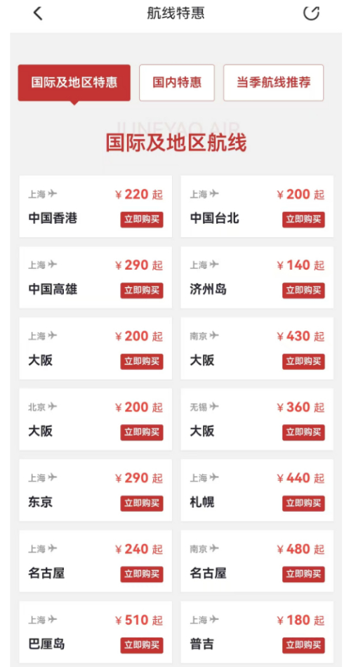 在吉祥航空特惠专区,不少国际及地区航线的价格颇为吸引人。从上海至济州岛不含税的票面价为140元,从上海前往泰国普吉、曼谷、清迈的不含税的票面价在180元至240元不等。