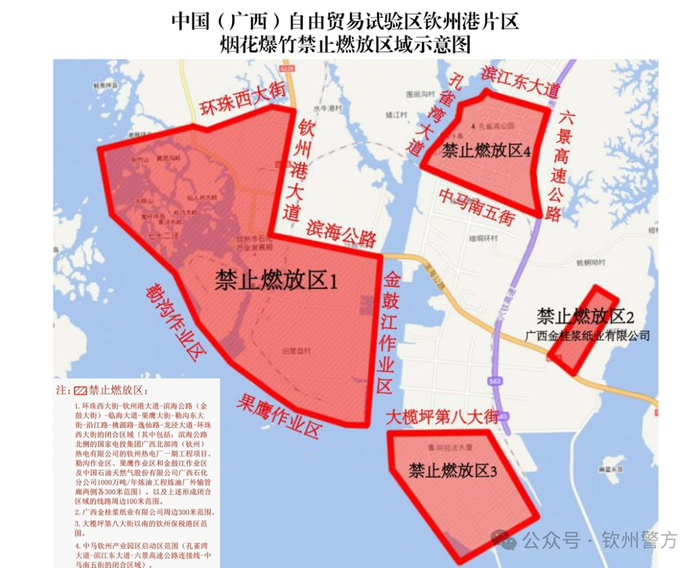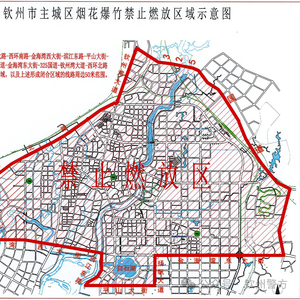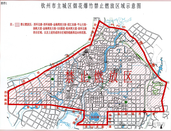 西环北路-西环南路-金海湾西大街-滨江东路-平山大街-扬帆大道-金海湾东大街-325国道-钦州湾大道-西环北路闭合区域,以及上述形成闭合区域的线路周边50米范围为禁止燃放区域。