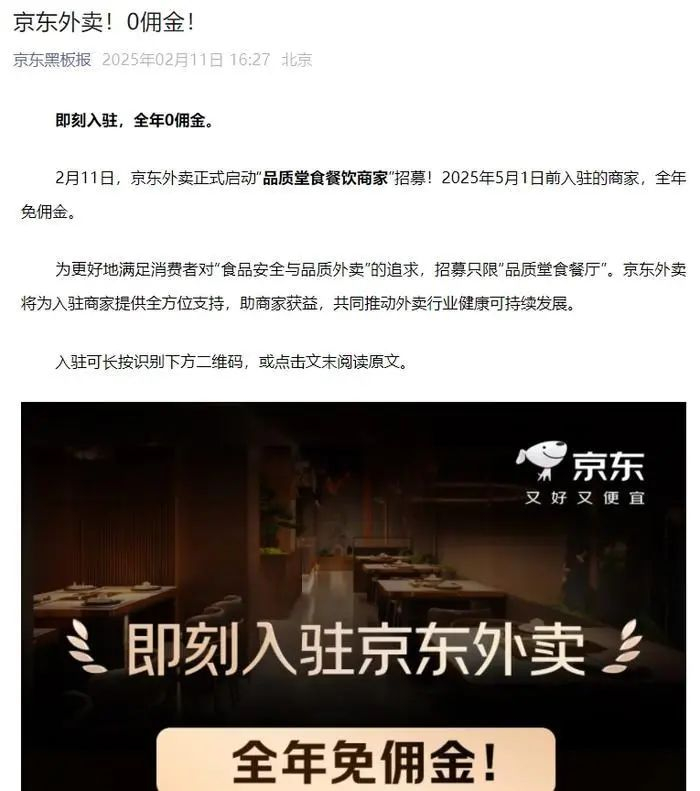 2月11日,京东宣布正式启动外卖服务,招募“品质堂食餐饮商家”,并承诺2025年5月1日前入驻的商家,全年免佣金。