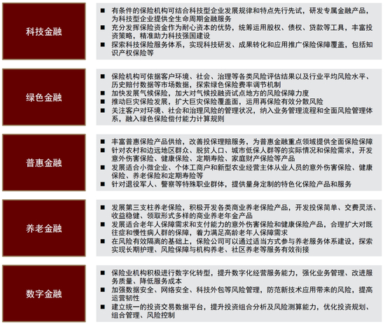 保险业同样作为我国金融体系的重要组成部分,具有经济“减震器”和社会“稳定器”的特有功能。我们认为,保险业的独有特征对落实金融“五篇大文章”有特殊意义,一方面保险业具有风险保障的功能,在经济结构的阶段性调整过程中为实体经济活动的稳健发展提供保障;另一方面保险资金具备“耐心资本”的优势,通过发挥其长期稳定的优势持续增加对“五篇大文章”重点领域的融资支持,优化融资结构。国家金融监督管理总局针对绿色保险和普惠保险发布了指导意见。