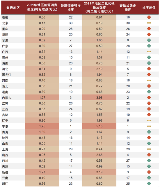 注:1. 数据未包含西藏、中国香港、中国澳门与中国台湾。2. 排序差值显示红色圆圈表示该省份碳排放强度地区排序小于能源消费强度地区排序,代表碳排放双控体系下节能减排压力或将上行;显示绿色圆圈则反之;显示黄色横线代表相对排序无变化。