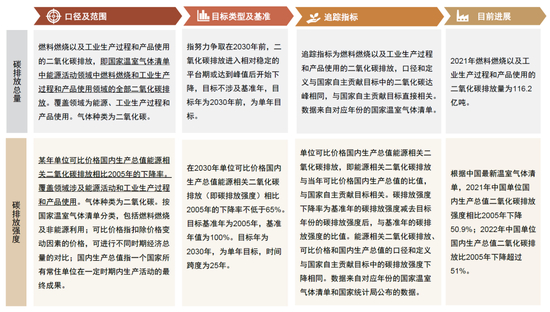 在2021年我国提交的《中国落实国家自主贡献成效和新目标新举措》中,中国的国家自主贡献目标中与碳排放总量和强度指标的内容更新为——“二氧化碳排放力争于2030年前达到峰值,努力争取2060年前实现碳中和。到2030年,中国单位国内生产总值二氧化碳排放将比2005年下降65%以上” [4]。《中华人民共和国气候变化第一次双年透明度报告》[5]中对“二氧化碳达峰”(对应碳排放双控中的总量指标)和“碳排放强度下降”(对应碳排放双控中的强度指标)进行了具体描述。